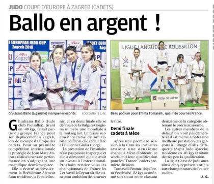 "Lors des championnats d’Europe cadets qui se sont déroulés à Sarajevo en Bosnie l’Ajaccienne Ghjuliana Ballo de l’Ass. Judo Pietralba a réalisé une énorme performance en se classant troisième. Bien en jambes dès le début de la journée elle disposait facilement de la grecque Balntidi Aikaterini au premier tour en la projetant en eri seoi nage et en concluant au sol par une clé de bras. Défaite par la suite en quart de finale par la médaillée européenne et mondiale l’ukrainienne Balaban Anastasia elle remonte les repêchages et gagne en place de troisième sur sa rivale nationale Lagarde Lilah en lui marquant un waza ari lors du golden score sur un magnifique uchimata.